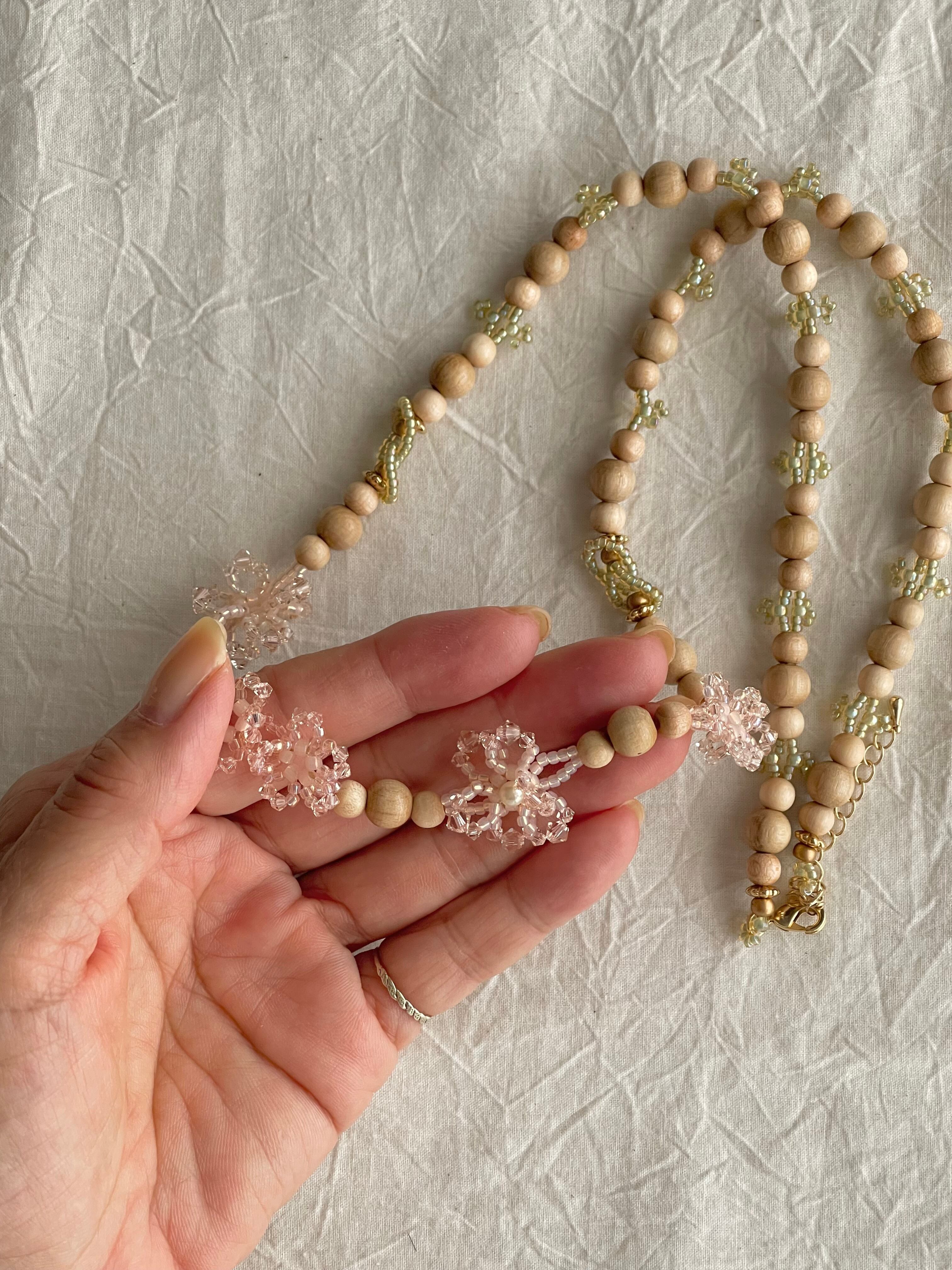 柔らかなさくら色のクリスタルとウッドビーズを組み合わせて、