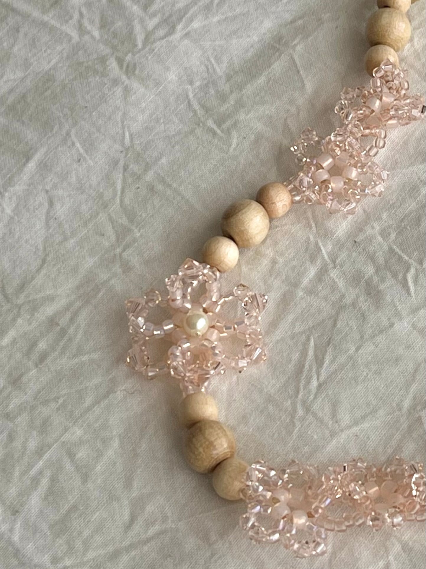 さくら色のガラスとウッドビーズを組み合わせた、