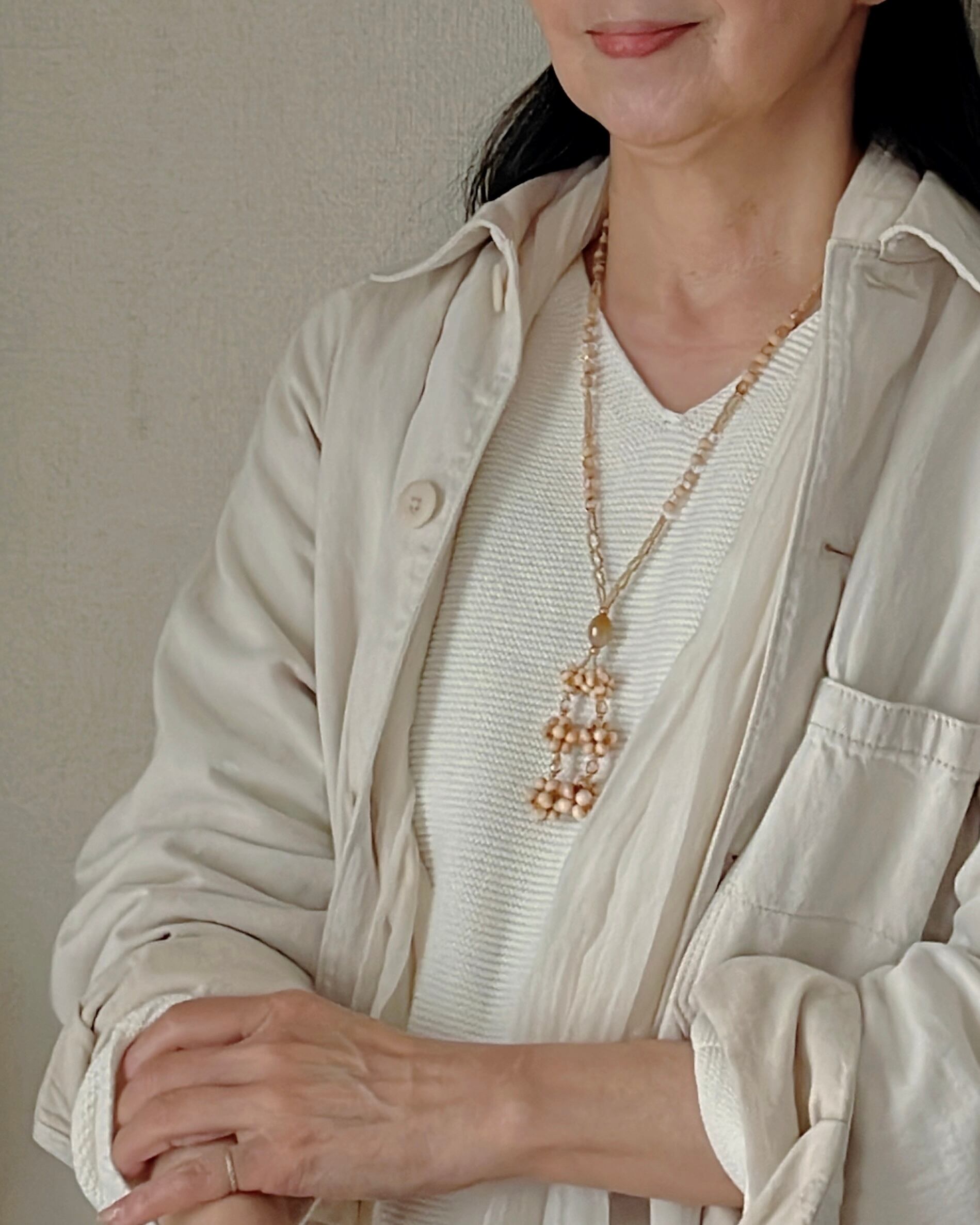 木の実のようなビーズボールを3種類組み合わせたペンダントです。