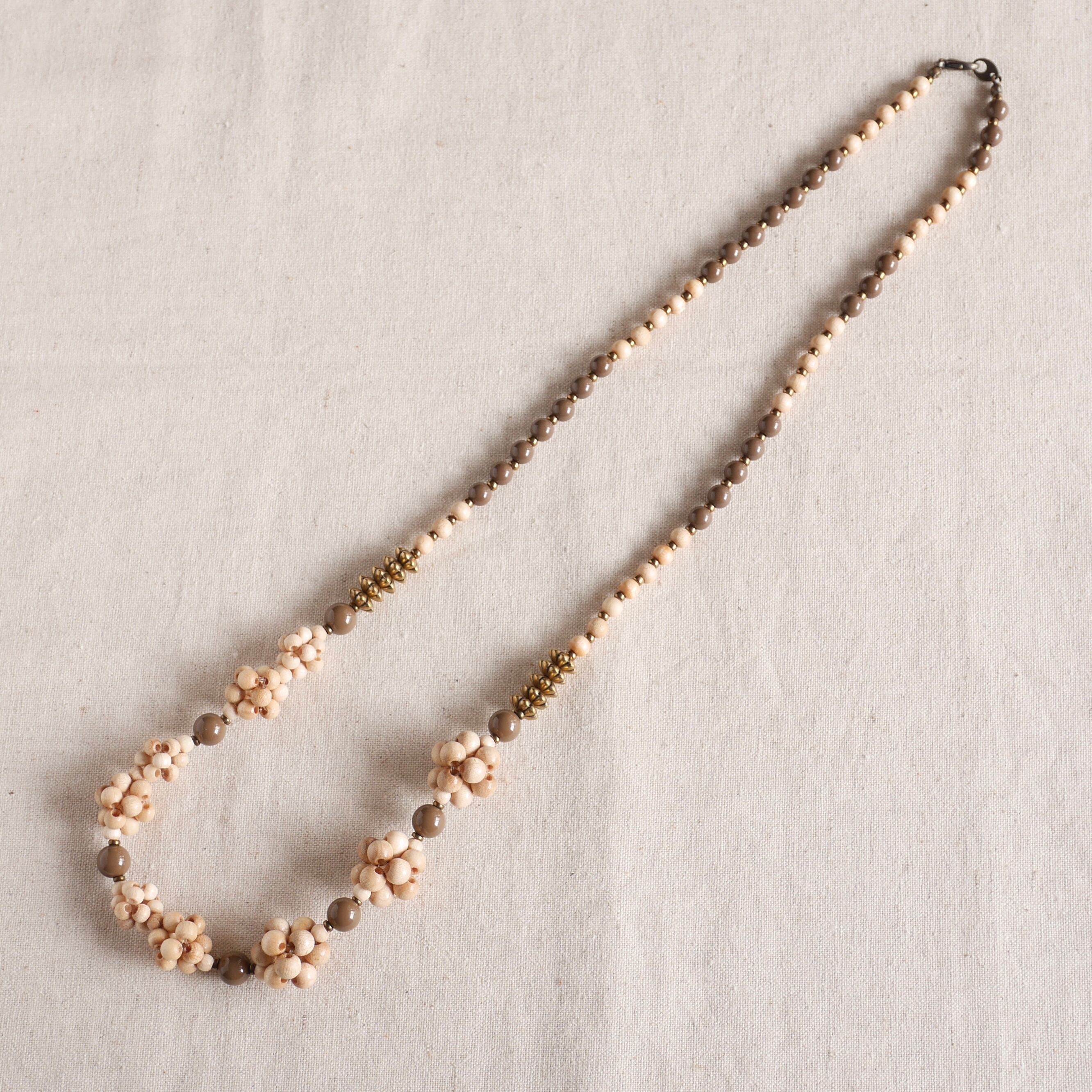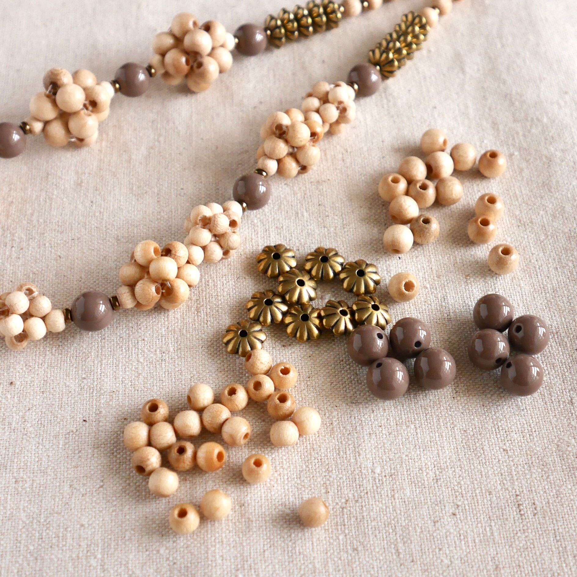 このウッドビーズのボールに合わせたビーズは、不透明のグレージュカラーの軽いビーズです。