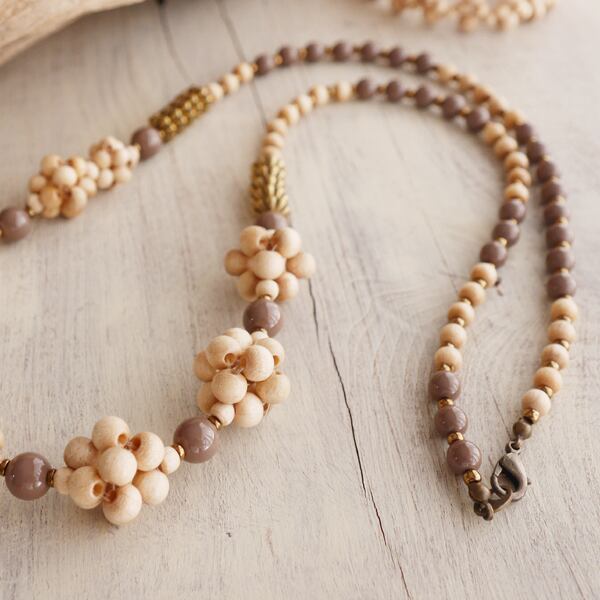木のぬくもりが優しく温かみがあり、つぶつぶとしたウッドビーズのボールがかわいいロングネックレスです。