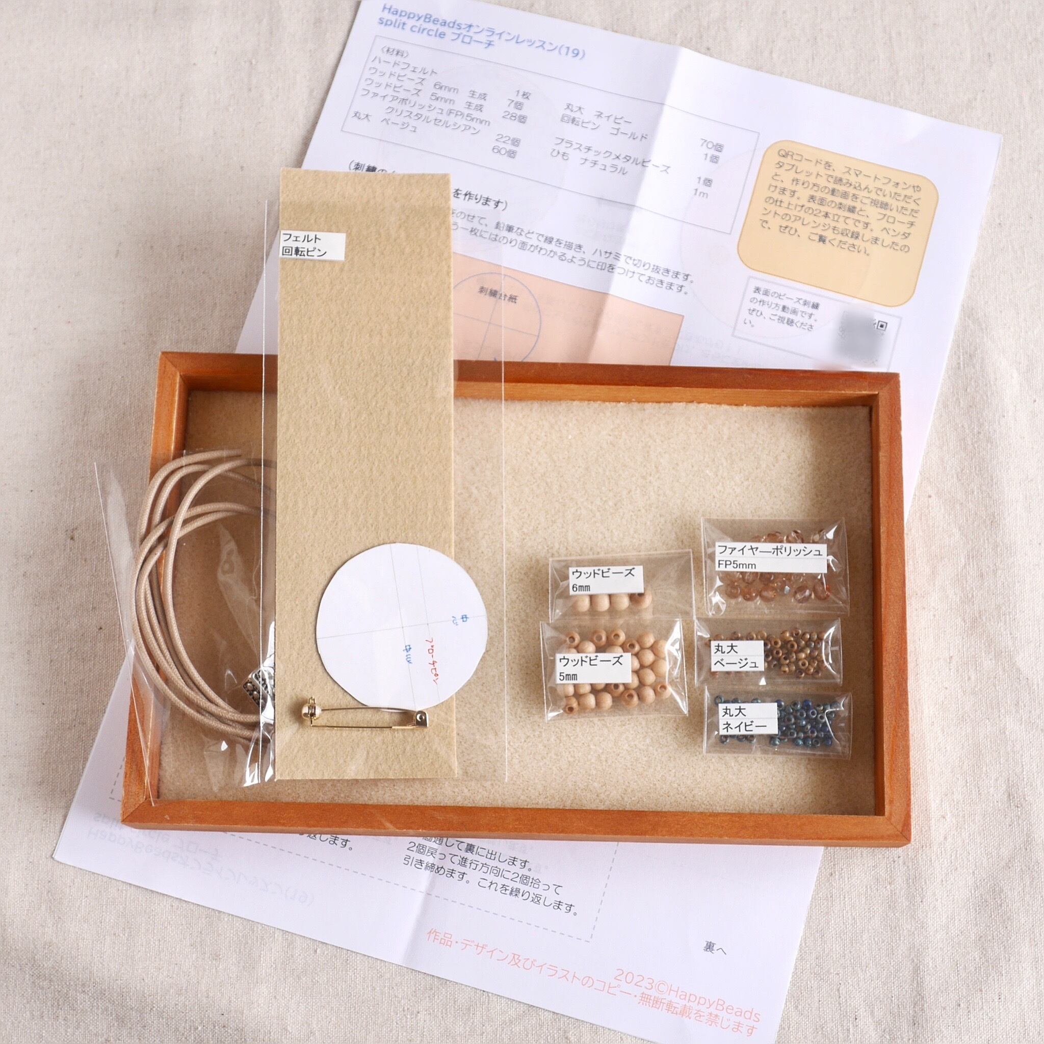 ハードフェルトという固いフェルトに、大きめのビーズを留めつけるのでサクサクと作り進めていただけます。