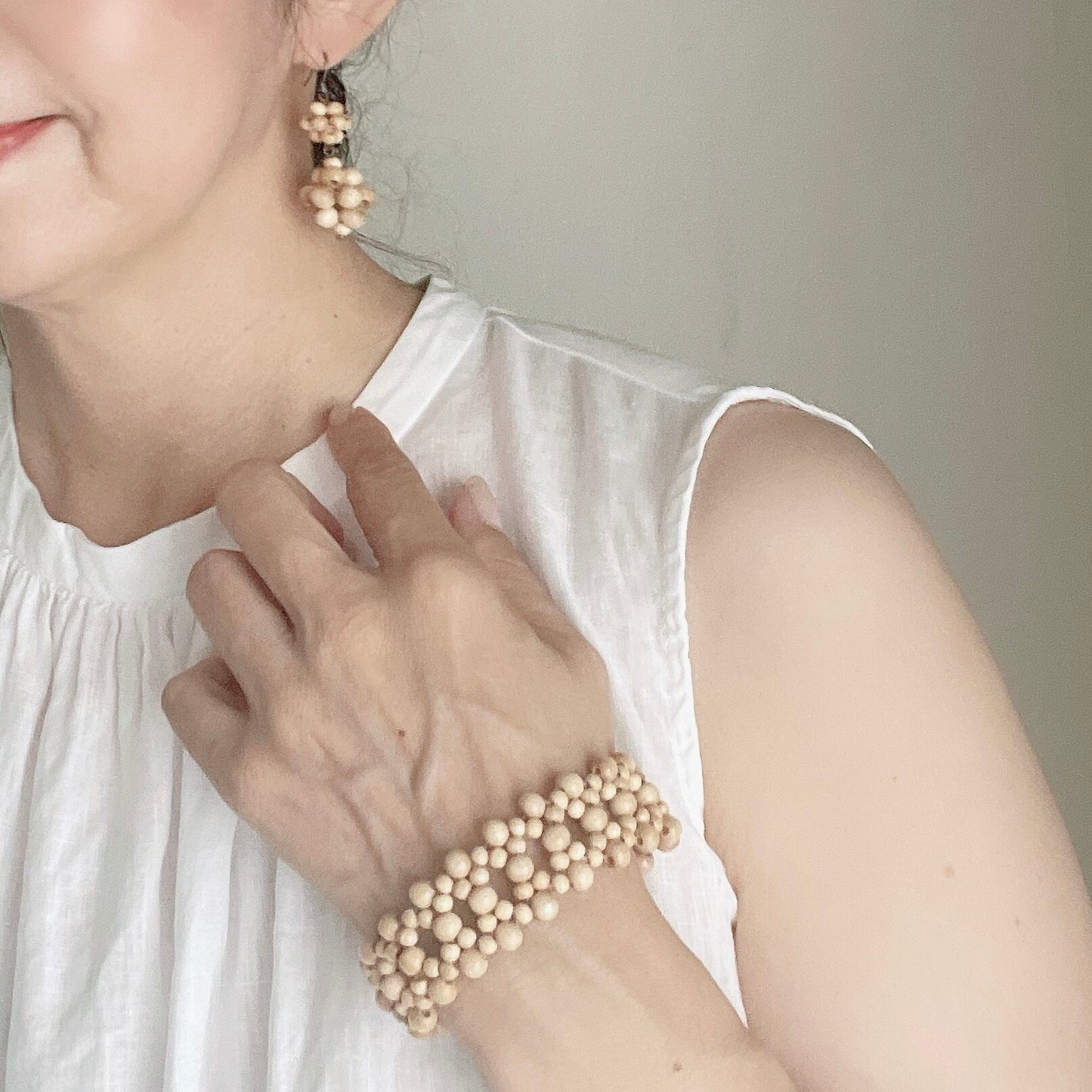 自然の木の色をそのまま生かしたウッドビーズを使って、軽くて、さらりとした質感のバングルとイヤリング(ピアス)のセット。爽やかな印象のアイテムです。