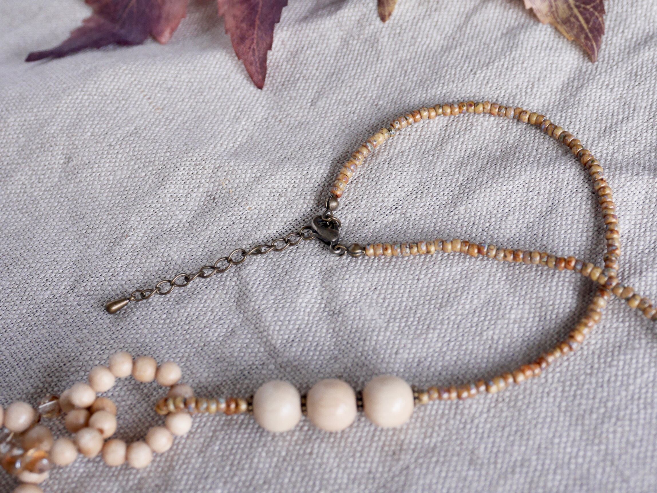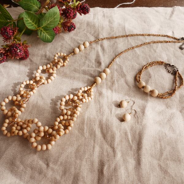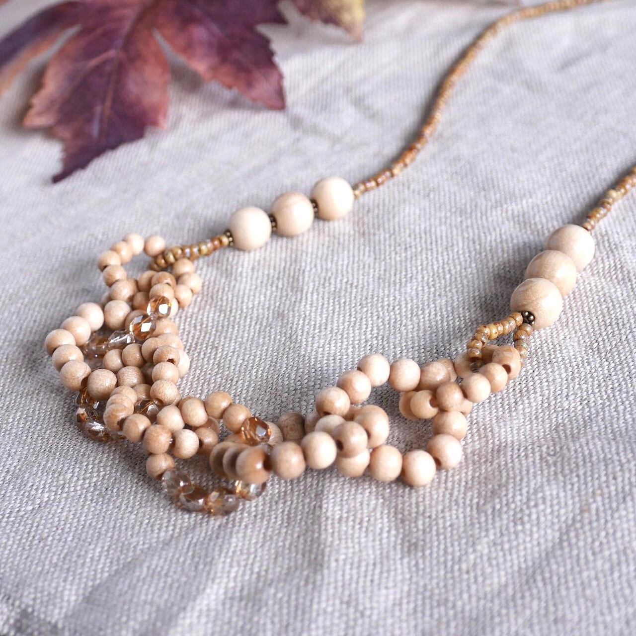 ウッドビーズをテグスに通してリングを作り、つなげてつなげて、チェーン状のトップを作って仕上げるミドル丈のネックレス。