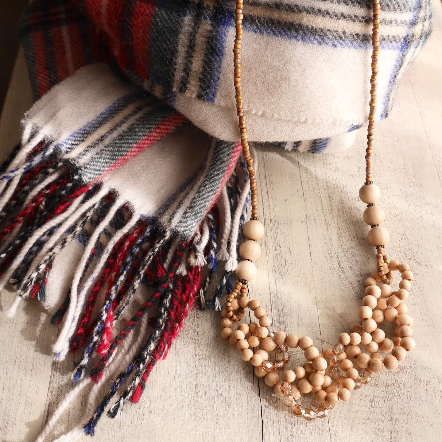 ウッドビーズの中にチェコビーズの艶っとした輝きは、まるで冬の木立の中に陽の光が差し込んでいるよう。