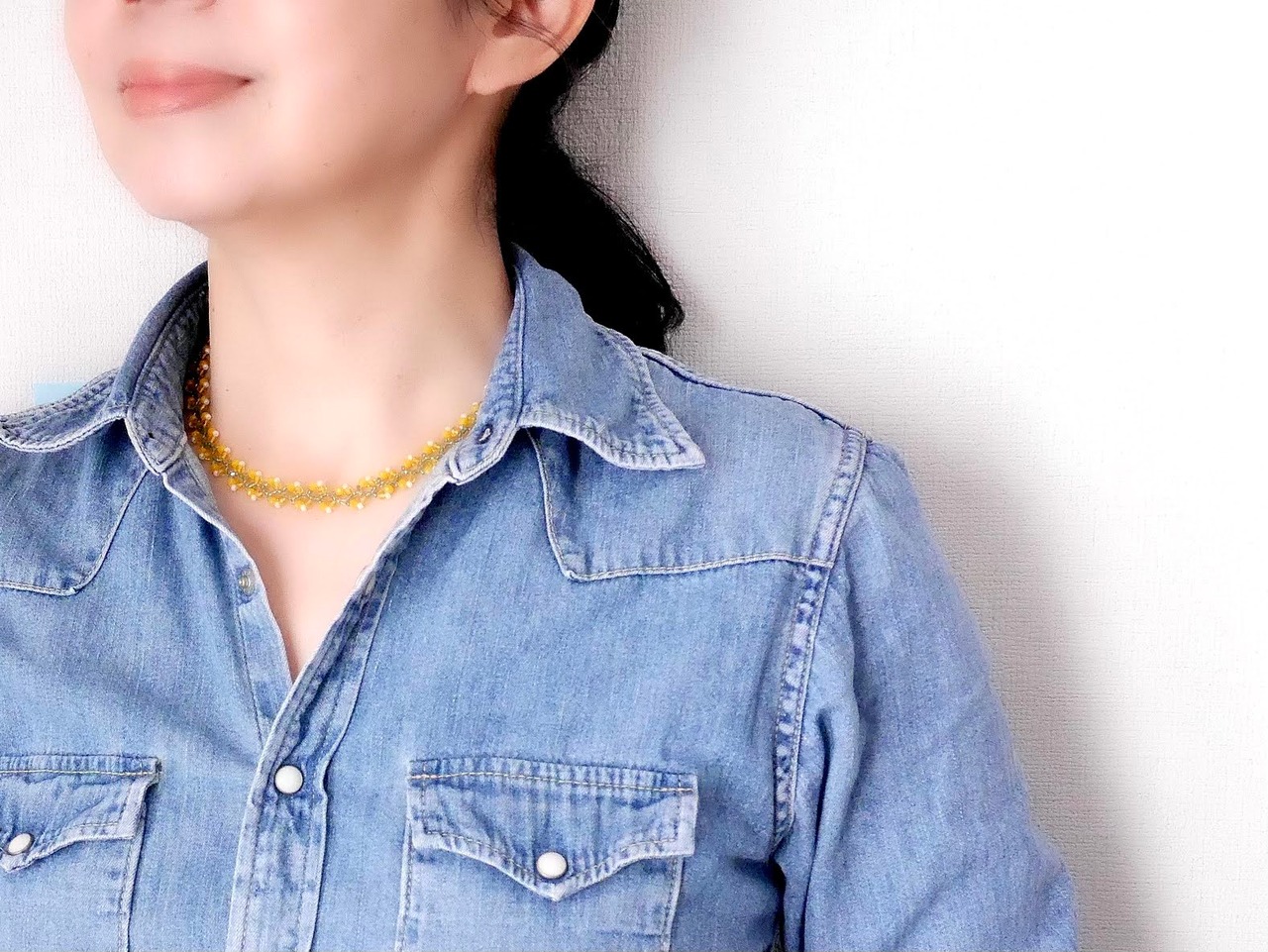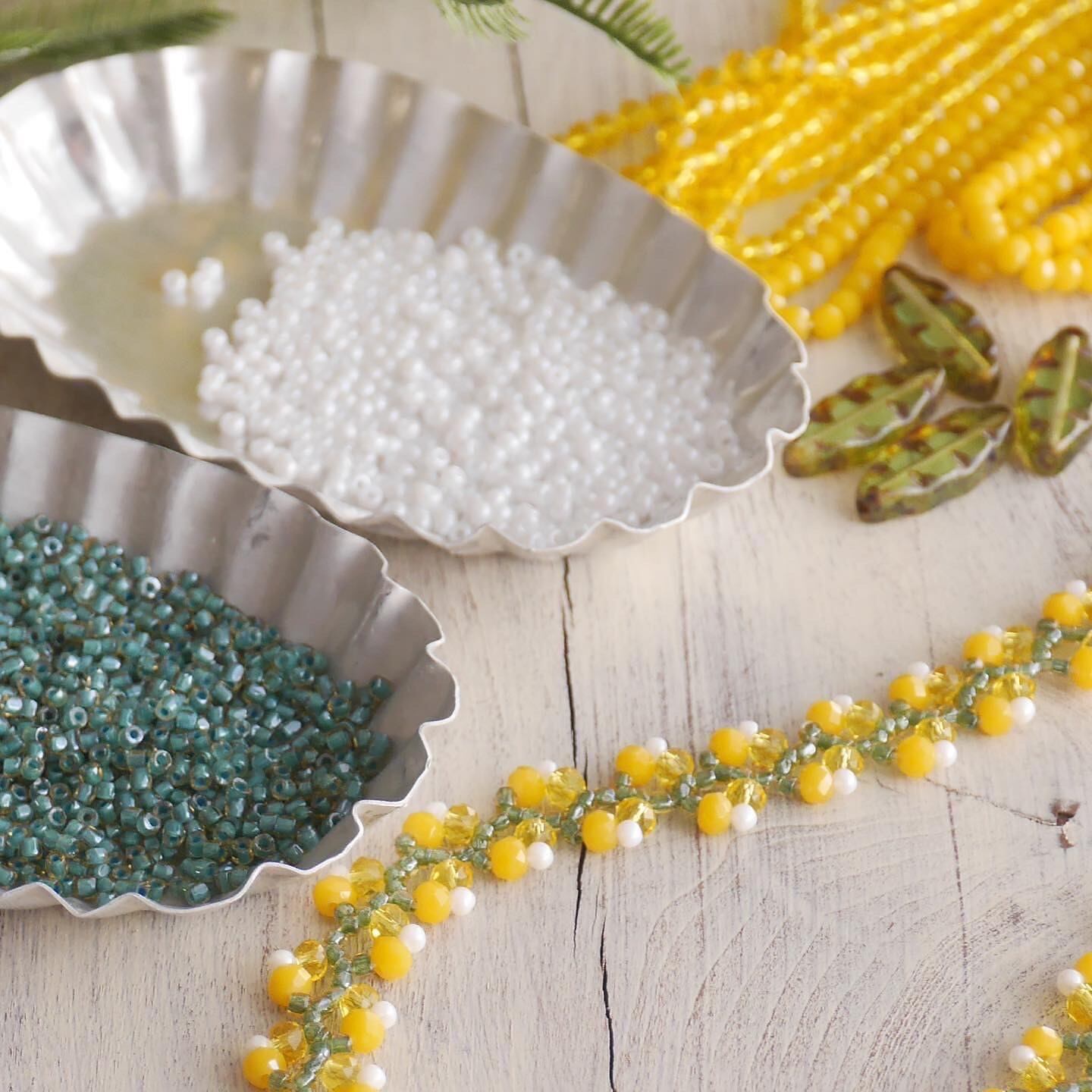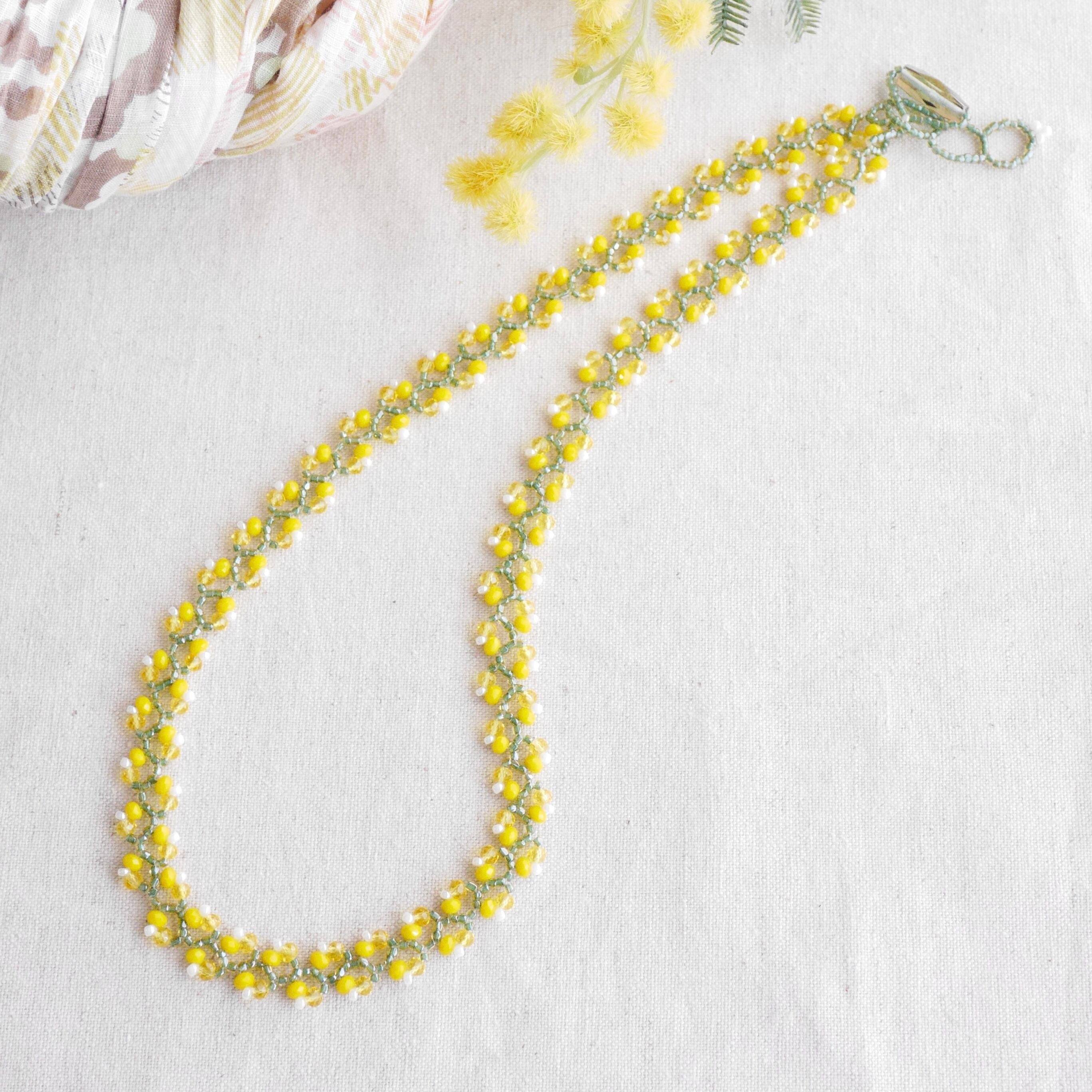 このネックレスは、もともとほかの色でデザインしたものだったのですが、SNSでのコメントからヒントをいただき、イエローとグリーンで作ったところミモザのお花のようにかわいく仕上がりました。