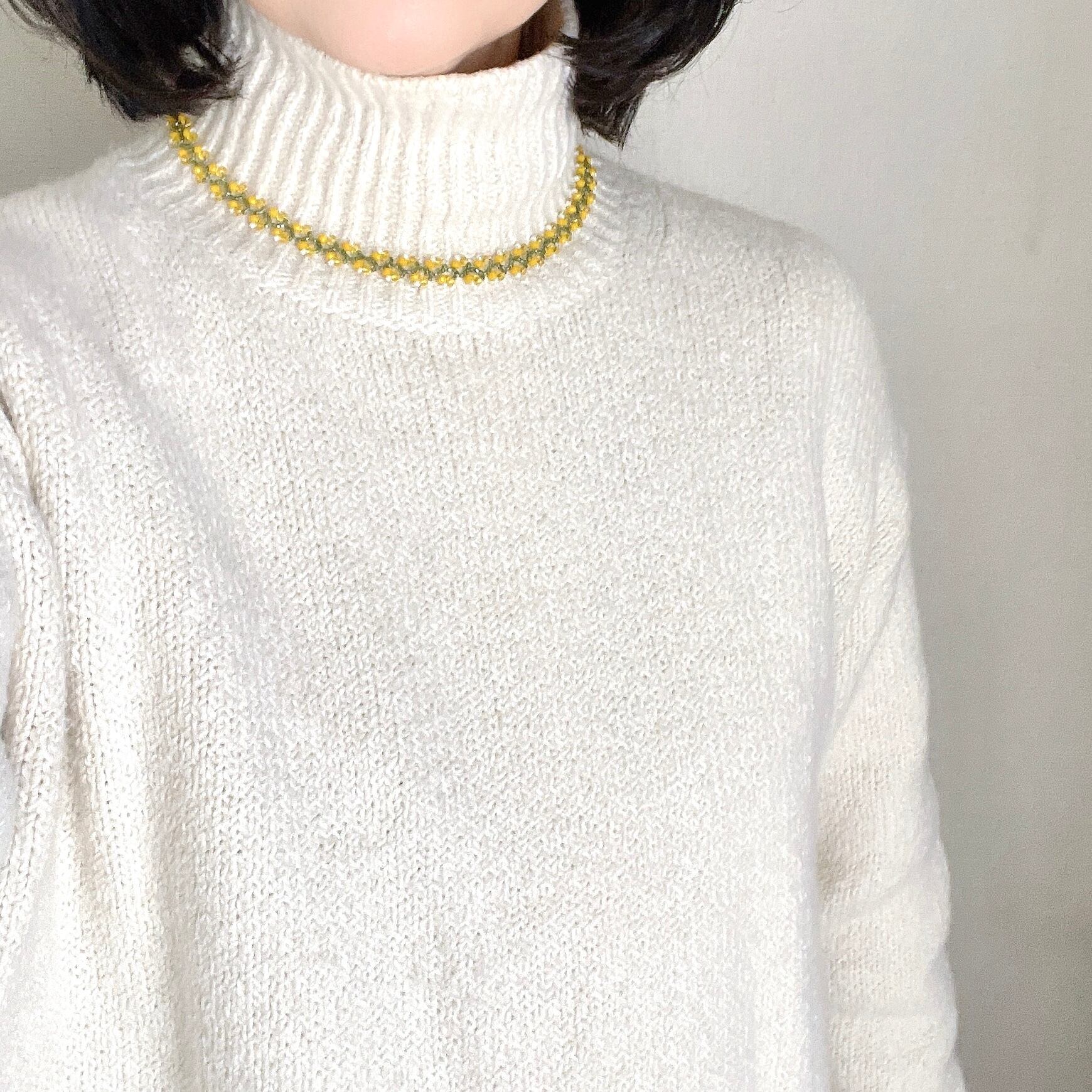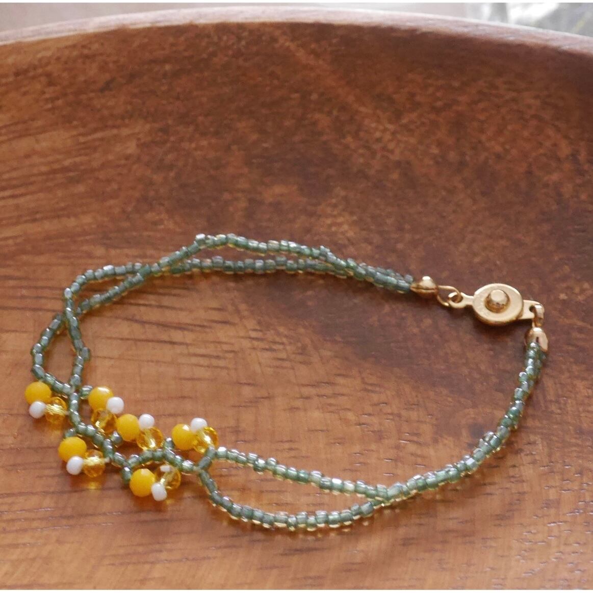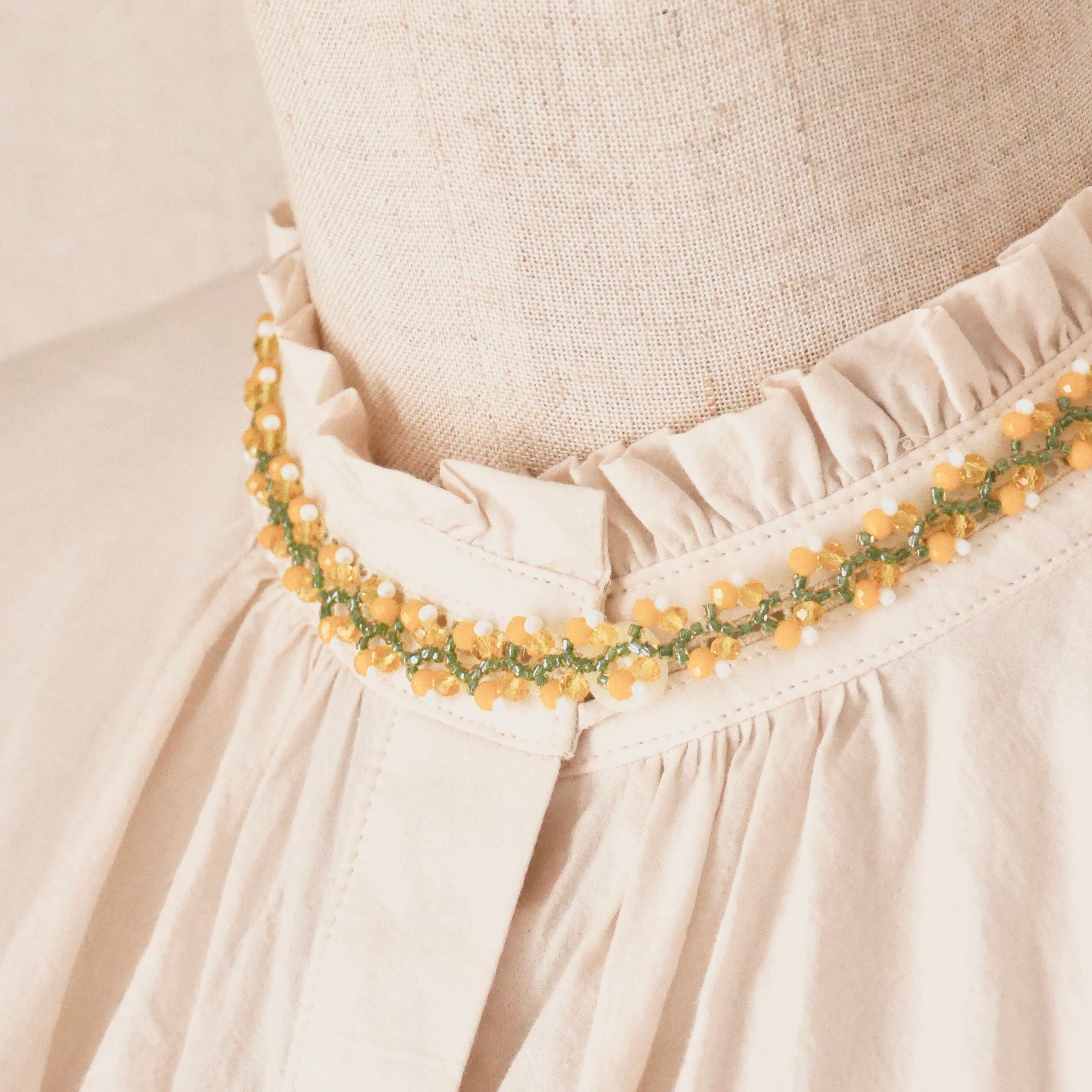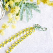 このネックレスは、もともとほかの色でデザインしたものだったのですが、SNSでのコメントからヒントをいただき、イエローとグリーンで作ったところミモザのお花のようにかわいく仕上がりました。
