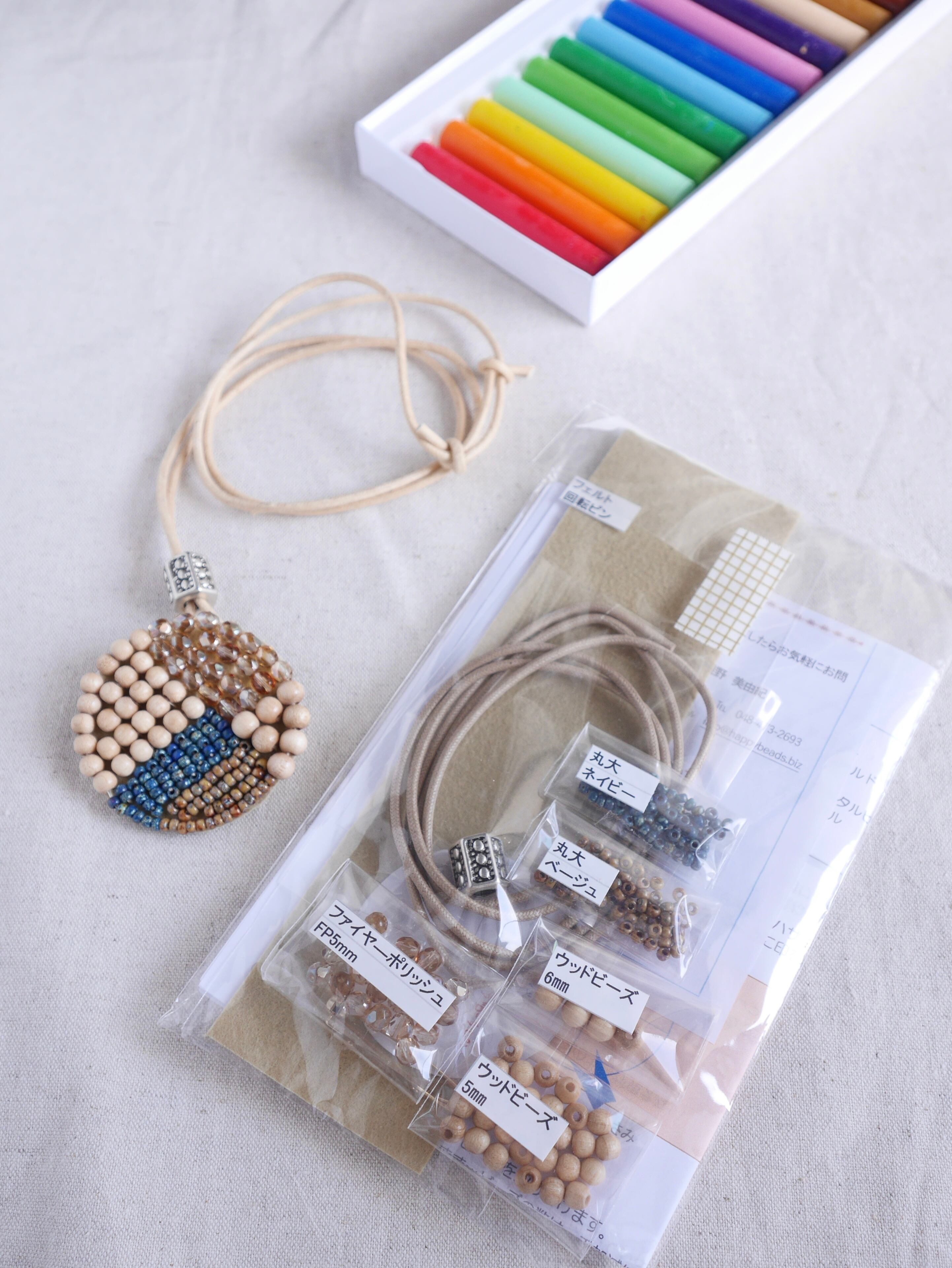 ハードフェルトという固いフェルトに、大きめのビーズを留めつけるのでサクサクと作り進めていただけます。