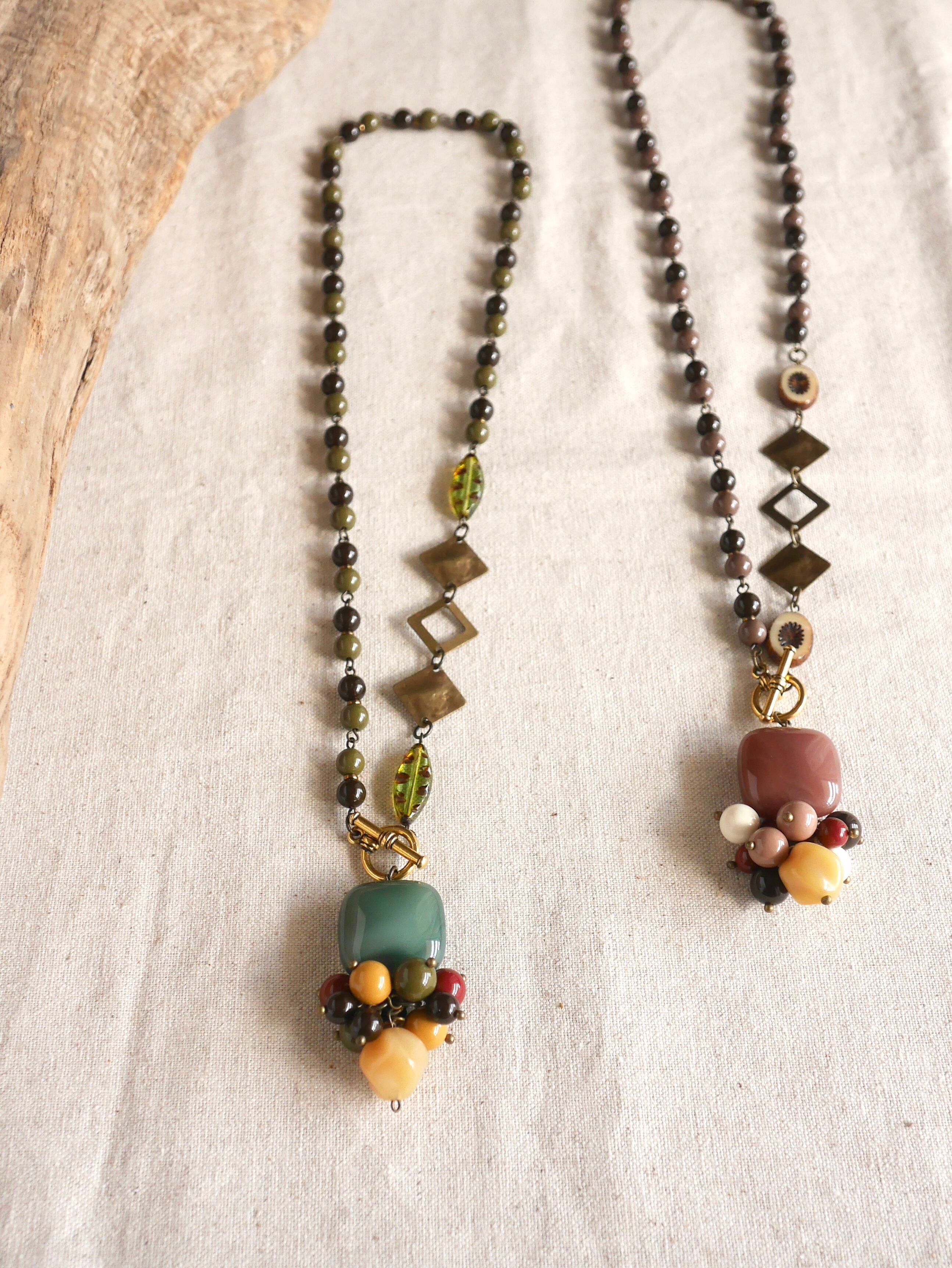 イタリア製の深い色のアクリルビーズ、アンティーク風の金属パーツ、チェコにガラスビーズをトップにつかい、軽さを出すためにアクリルパールでネックレスに仕上げています。