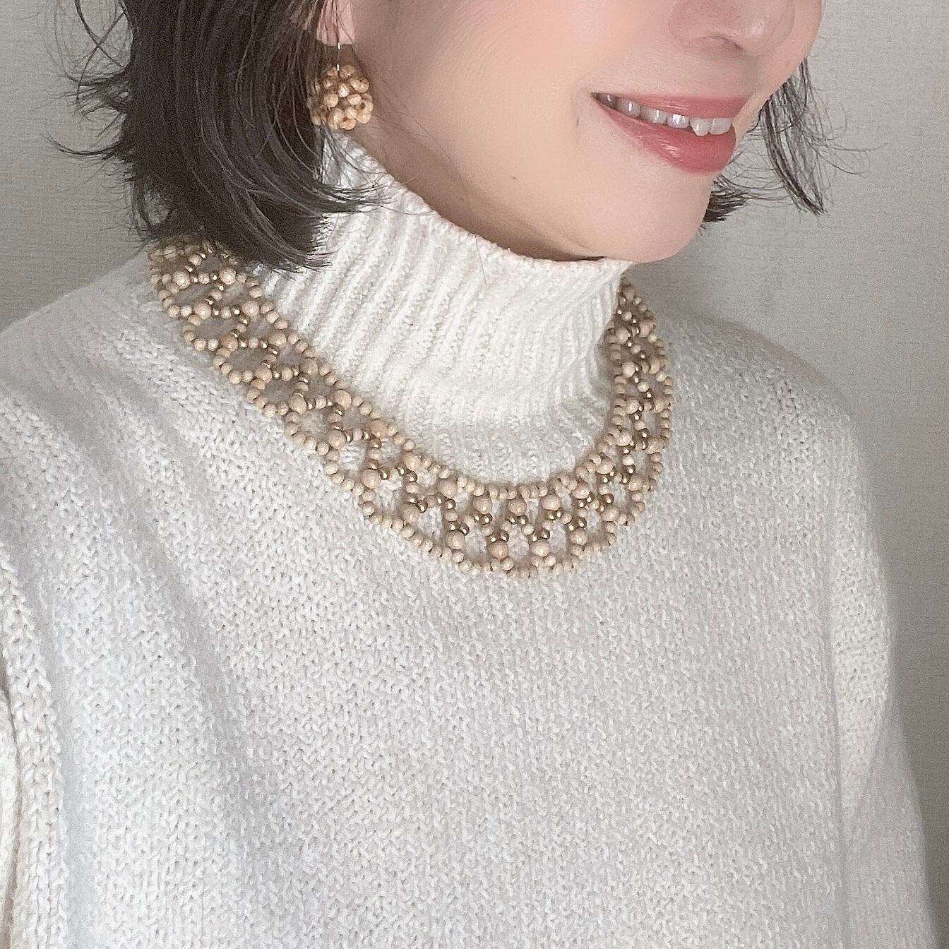 普段のカジュアルスタイルは、ときに生活感を感じさせてしまうこともありますが、ウッドビーズは、鈍い艶感がありカジュアルスタイルとなじみやすいので、ぜひ、普段着に合わせていただきたいと思っています。自分にひと手間かけて大人のゆとりを纏いましょう。