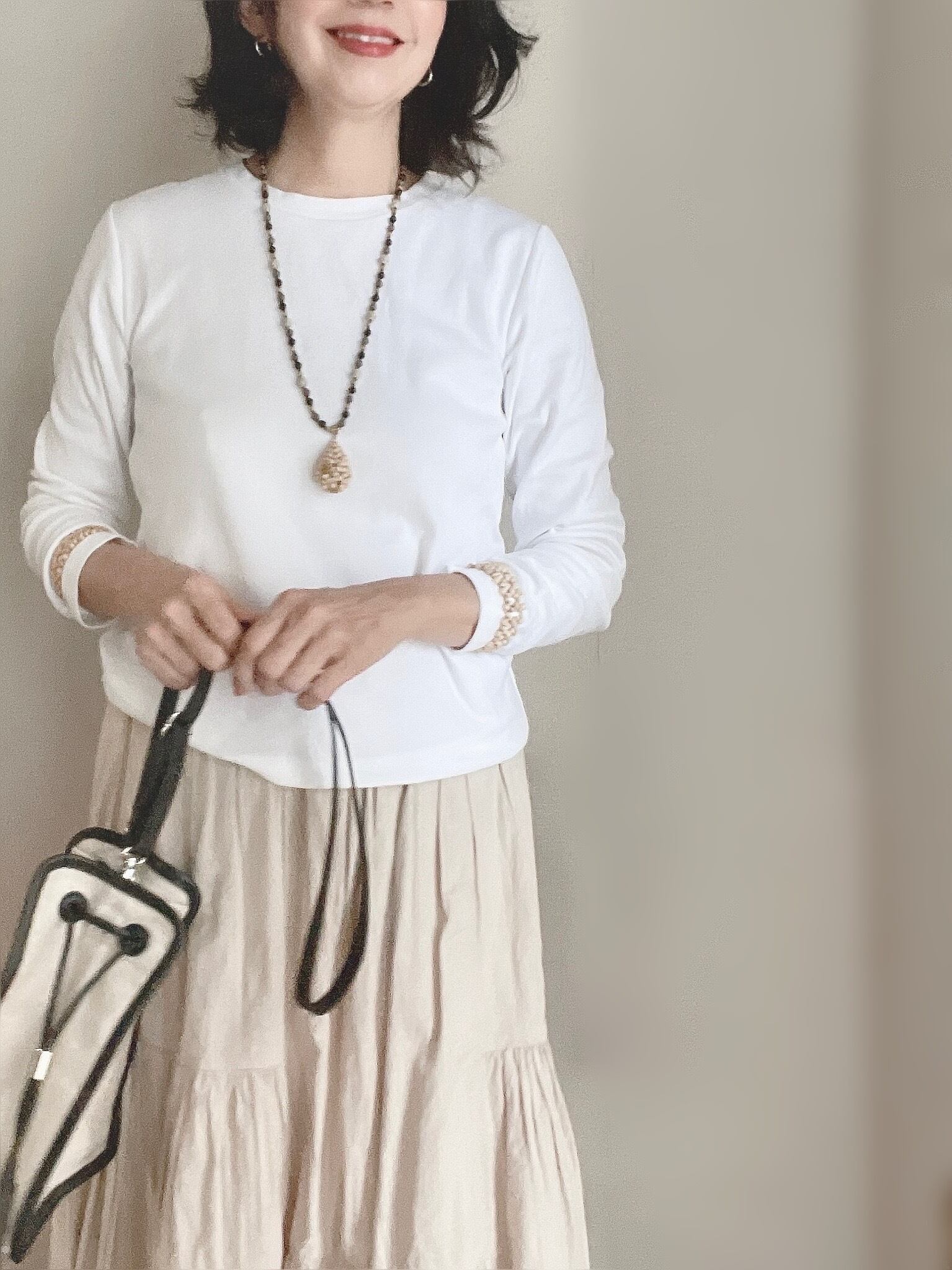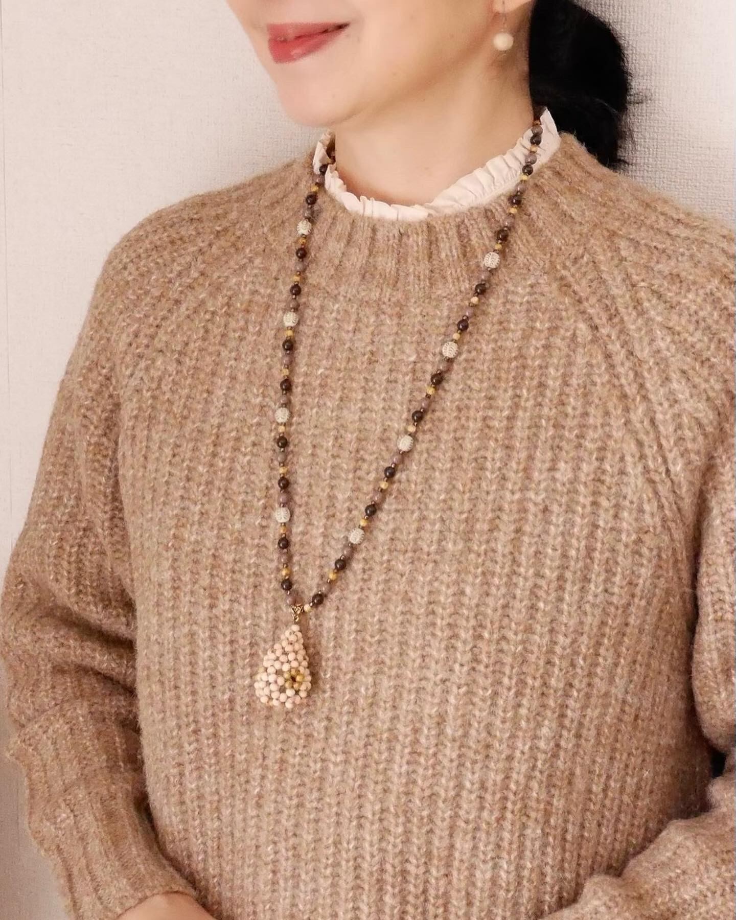 今風なゆったりとしたトップスに、このネックレスをつけてメリハリをつくり、キレイ目な大人のナチュラルスタイルが完成します!!