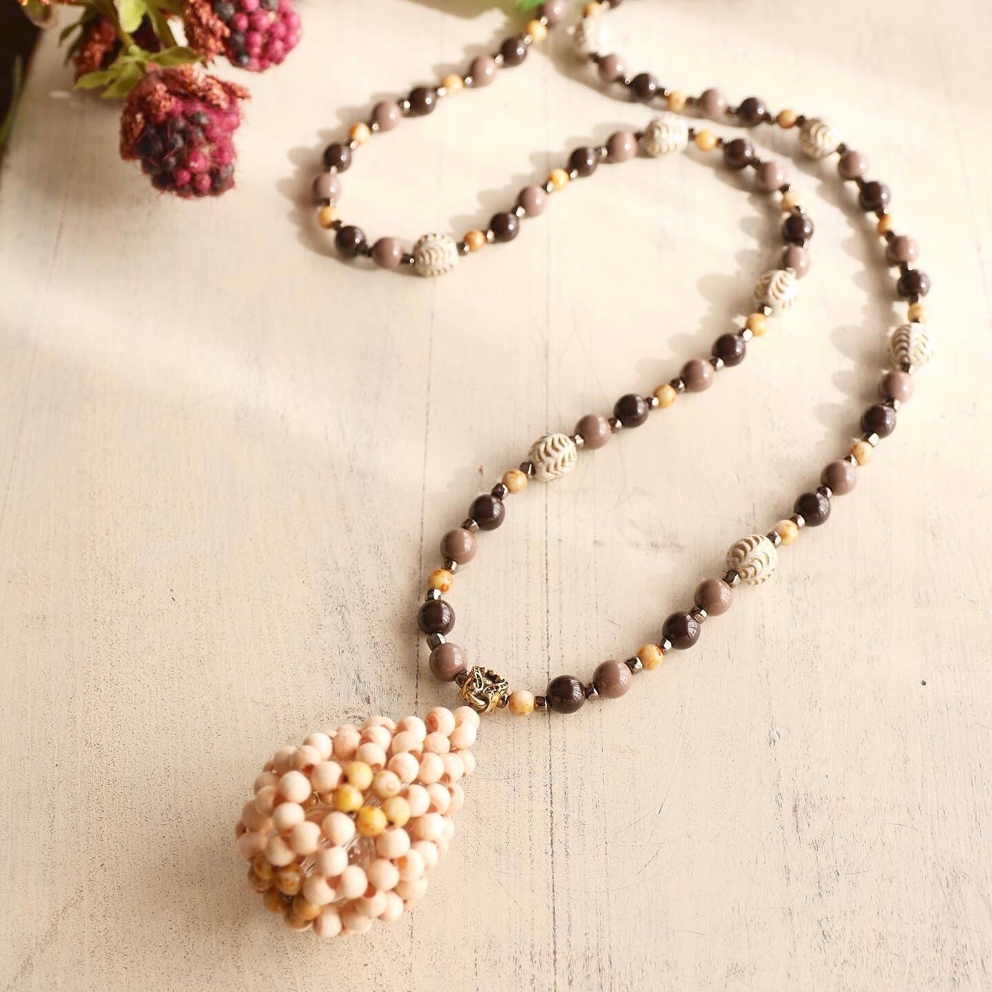 ウッドビーズをたっぷり使ったしずく型のモチーフのロングペンダント。