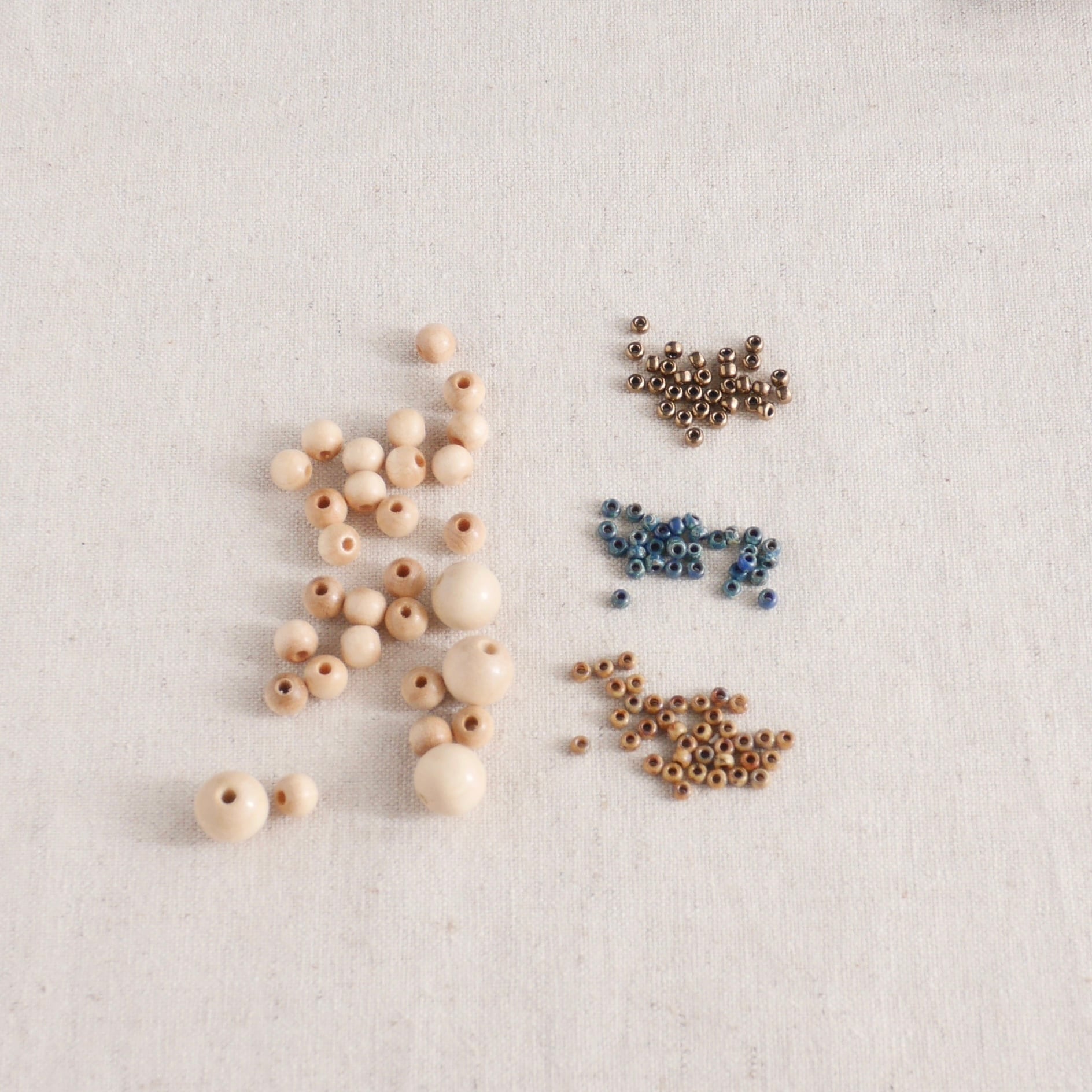 作品の題名にもなっているネイビーカラーの丸大ビーズは、石のような模様が施されていて、デニムとの相性がとても良く、とても気に入っていておすすめです。