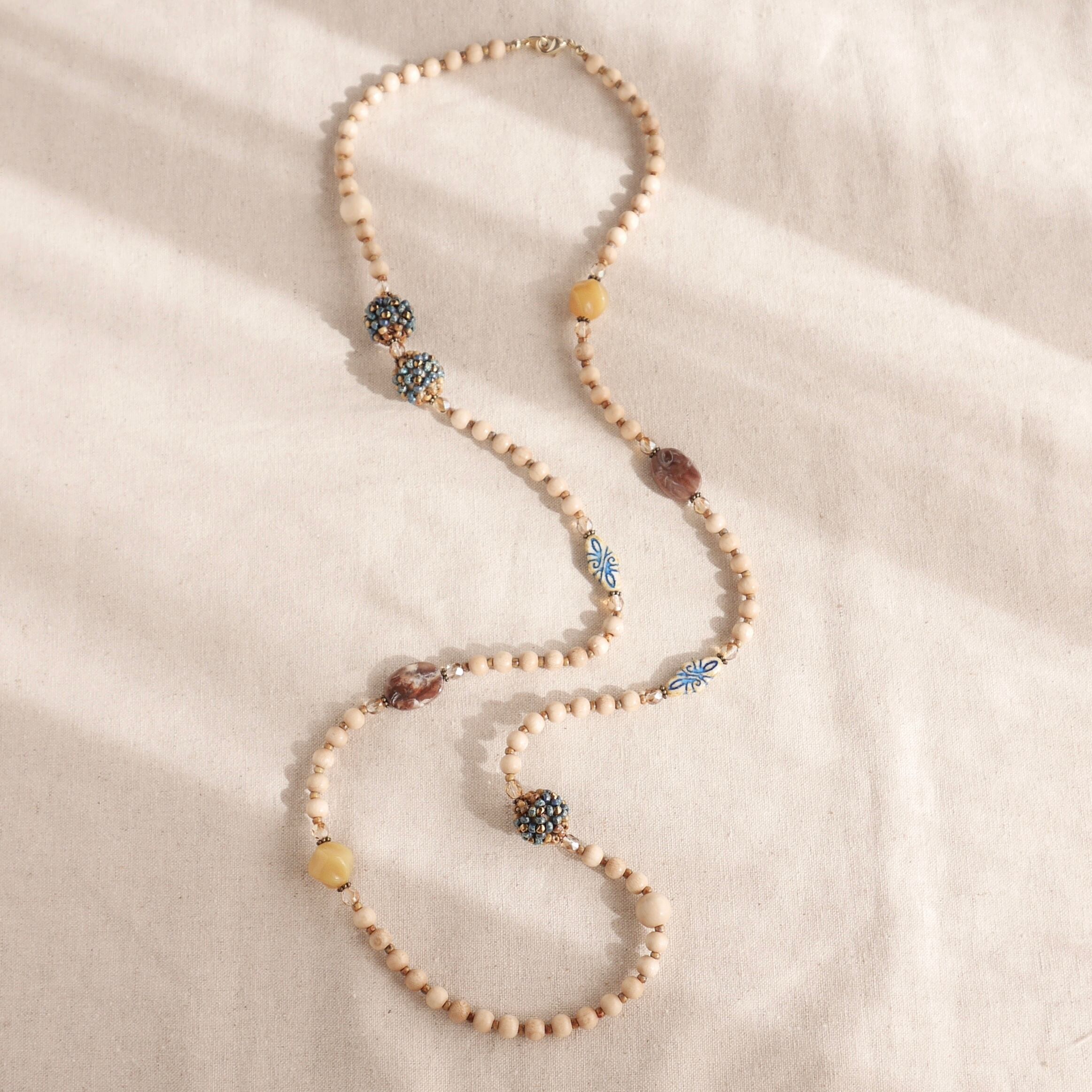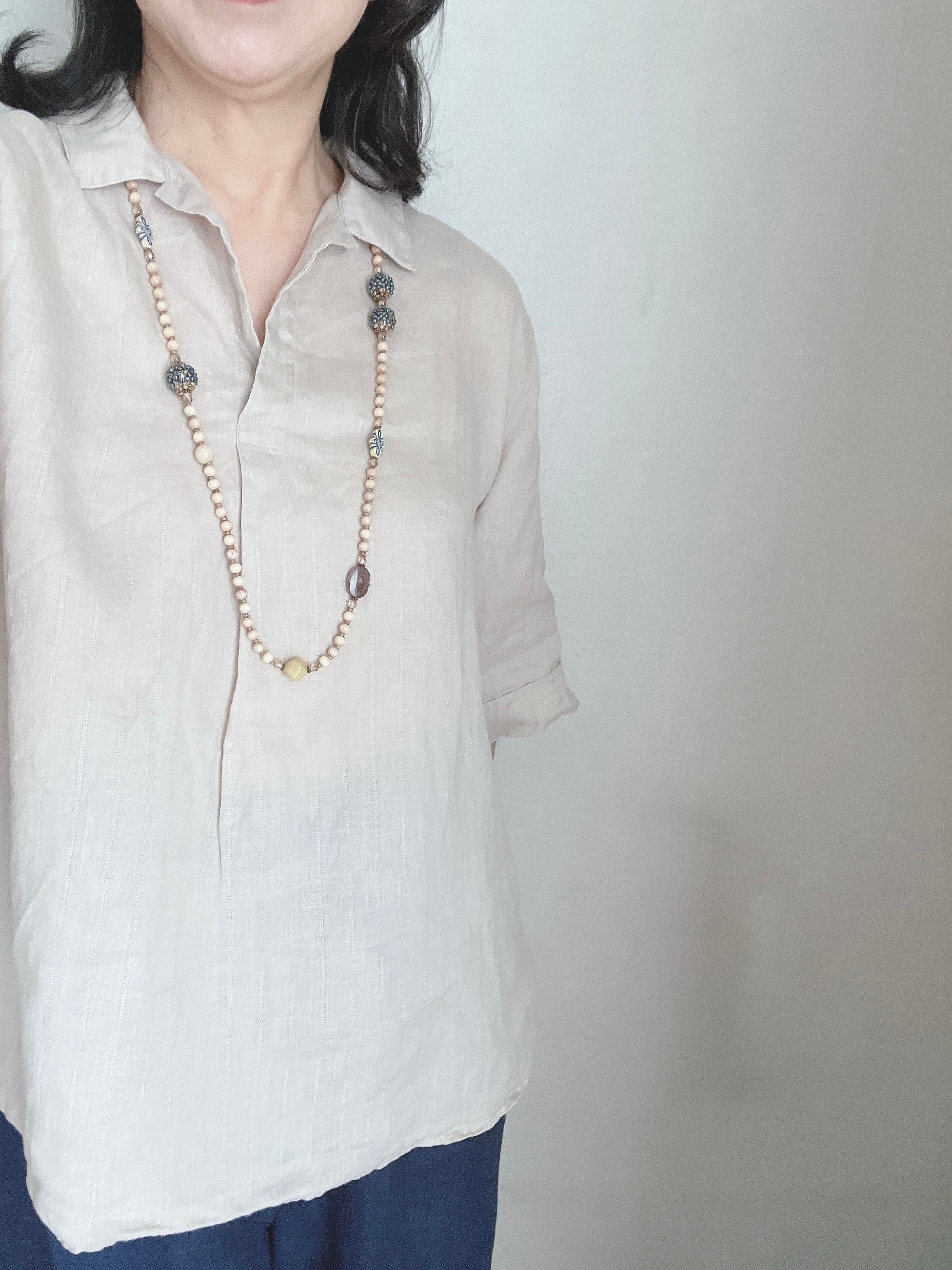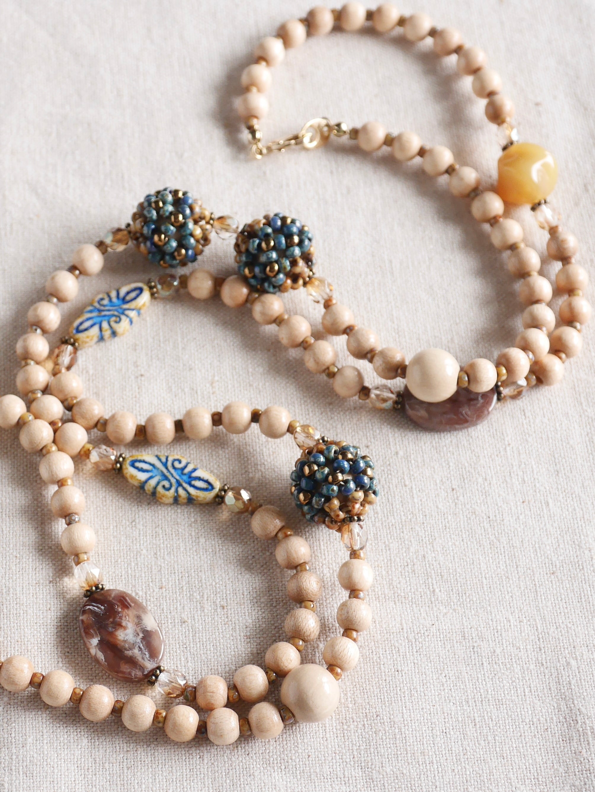 ウッドビーズをたっぷりと使用したネイビーのビーズボールがポイントのロングネックレスです。