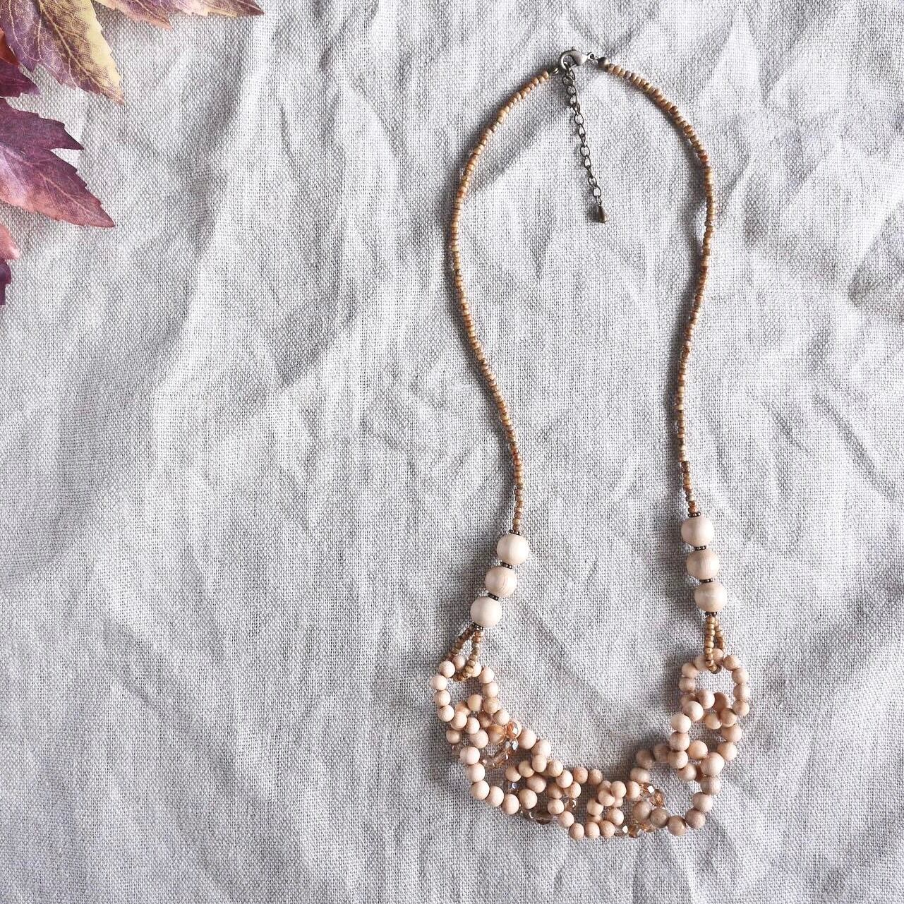 ウッドビーズをテグスに通してリングを作り、つなげてつなげて、チェーン状のトップを作って仕上げるミドル丈のネックレスです。