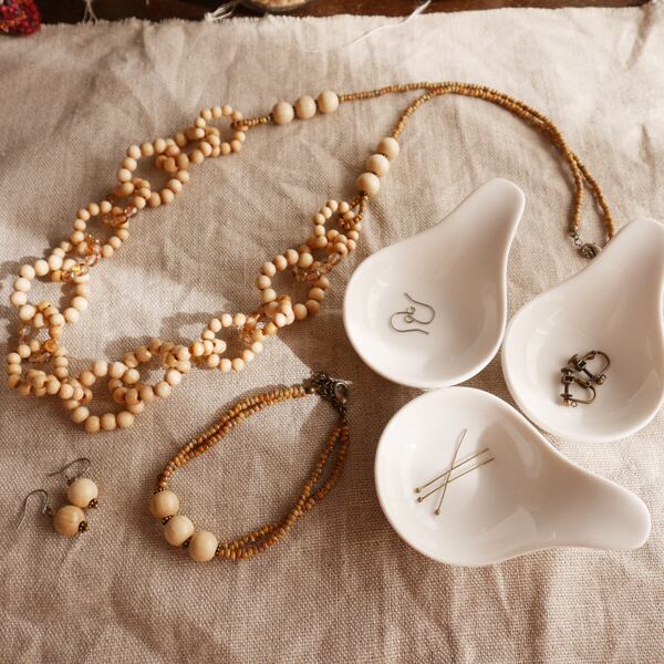 ウッドビーズはとっても軽いのでこれだけのボリュームを有しながらとても軽いのが特徴です。また、木材をくりぬいて作られていますので、木目の出具合で一粒一粒表情が違って、何とも言えない雰囲気のあるところが魅力です。
