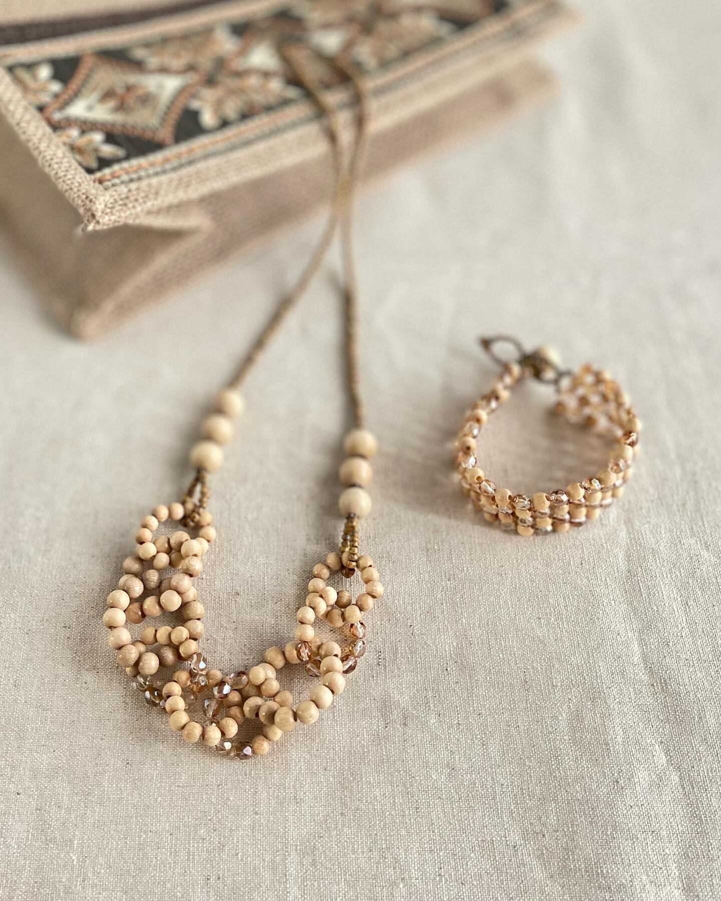 ウッドビーズの中にチェコビーズの艶っとした輝きは、まるで冬の木立の中に陽の光が差し込んでいるよう。