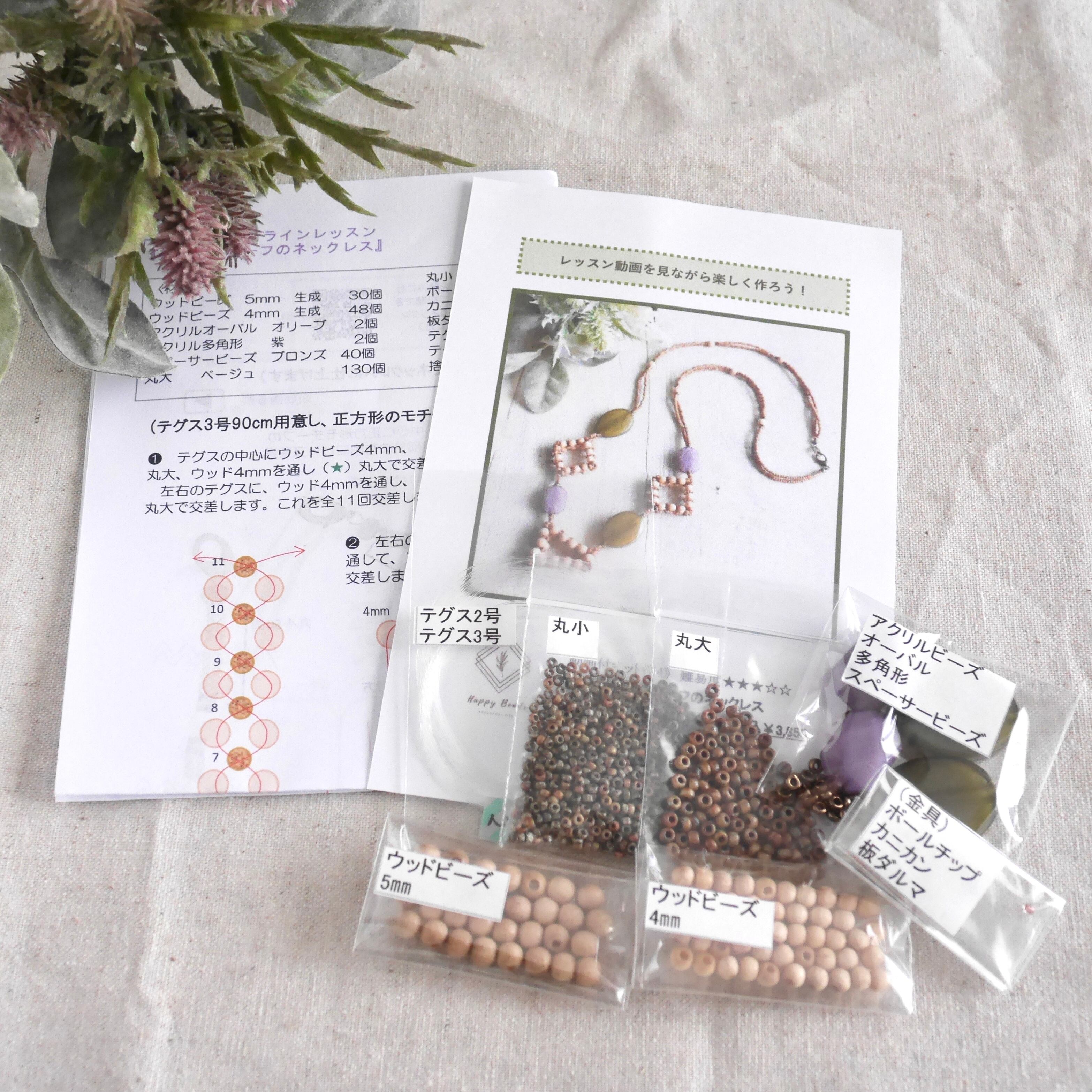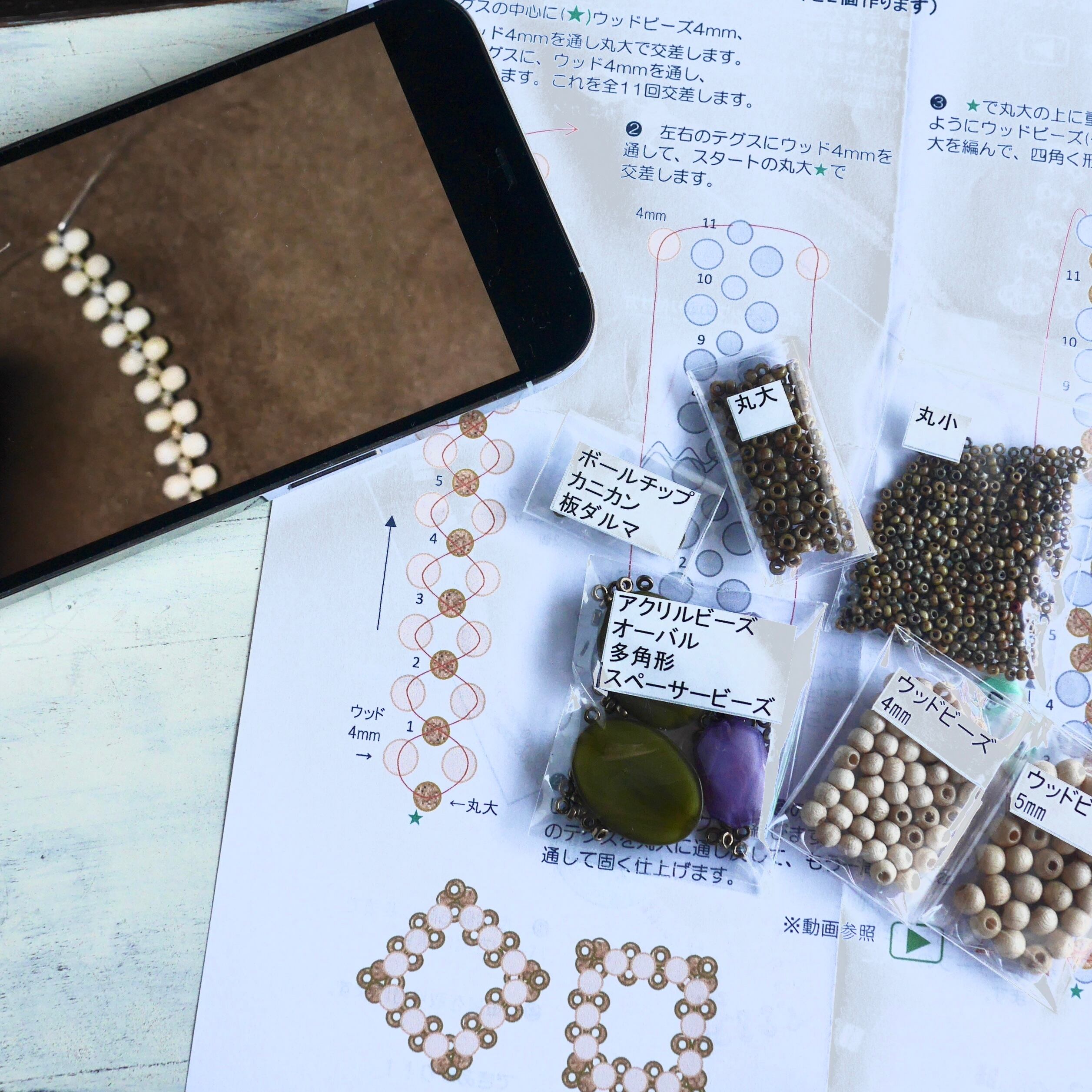 正方形と台形のモチーフを作ってつなげる、ビーズアクセサリーの動画付キットです。