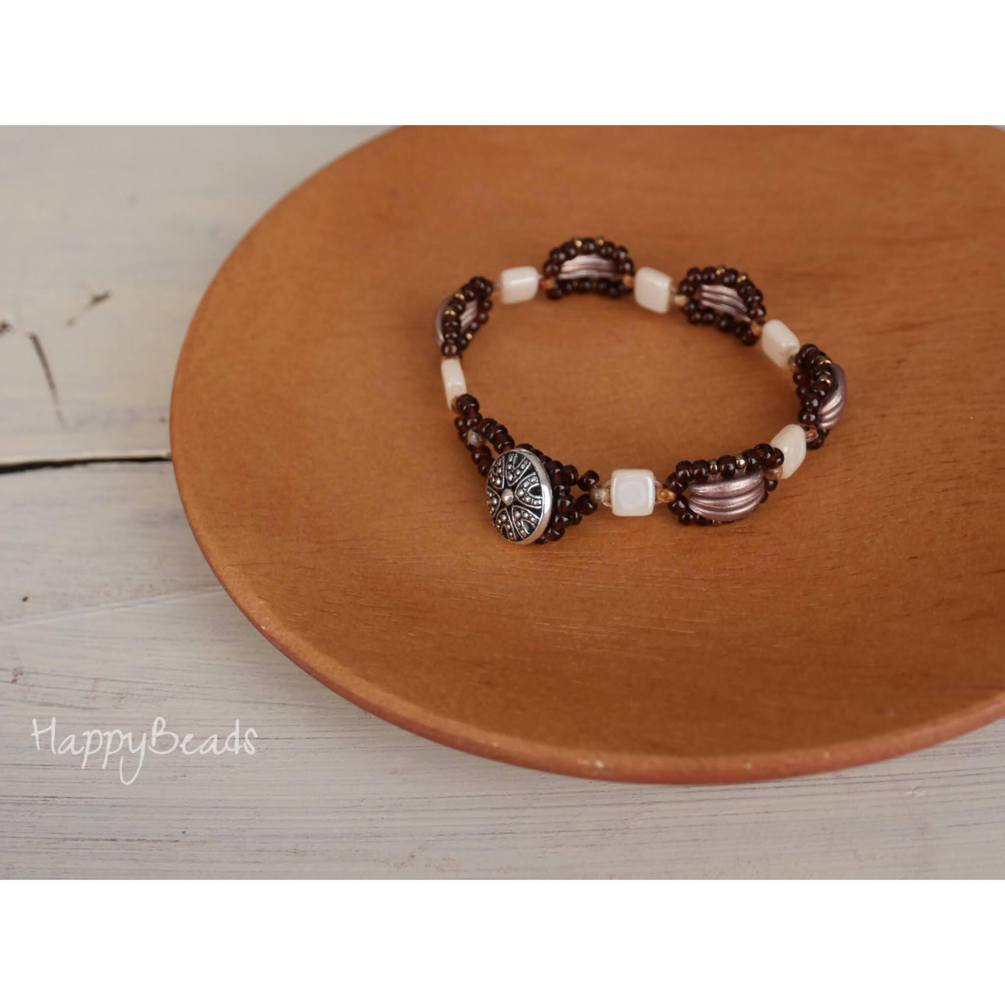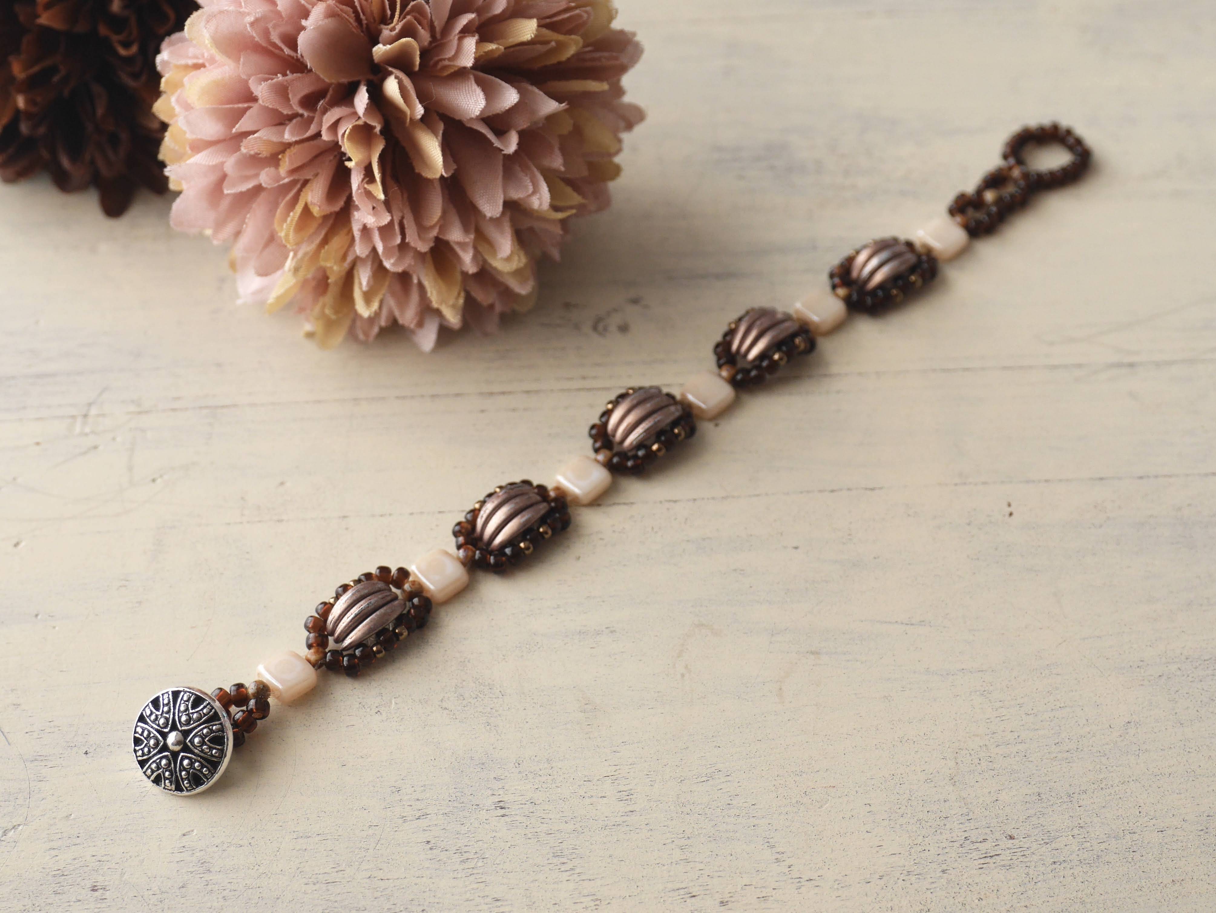 このブレスレットの縞模様に見えるところは、クレセントという名前の三日月形のビーズを3つ重ねて一つのビーズのようにして使っています。