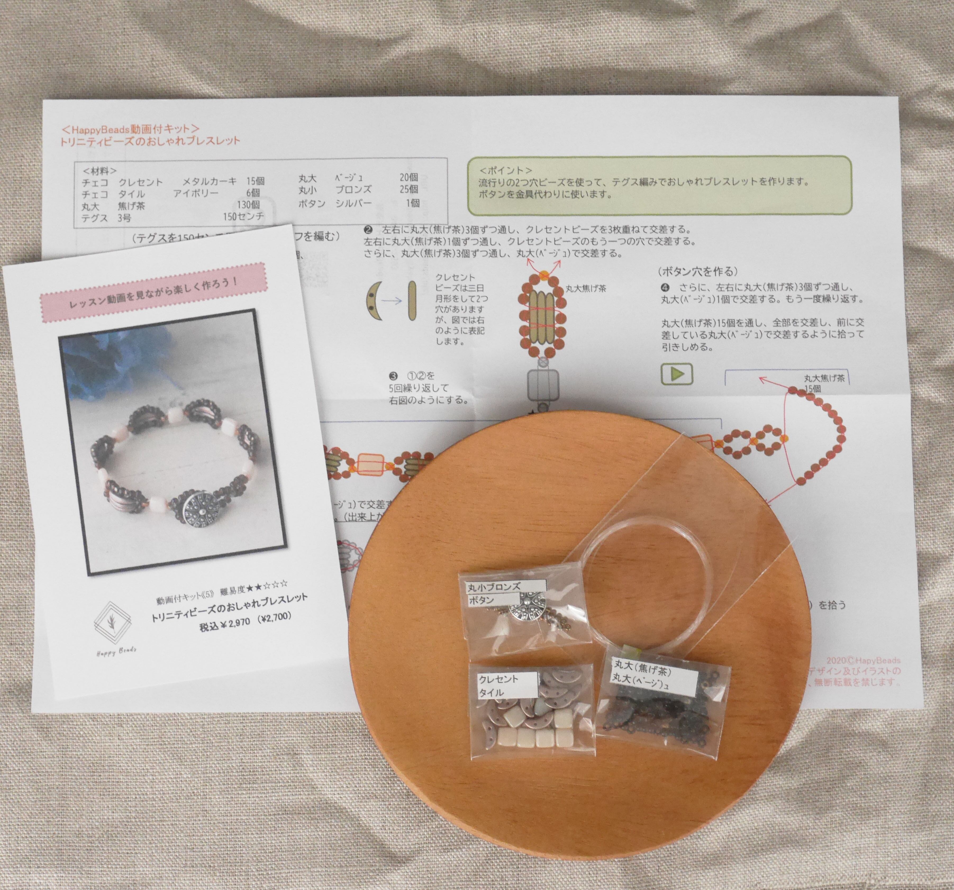 実は、このブレスレットはお教室の皆さんで作ったのですが、オーダーをいただいた生徒さんがいらっしゃったり好評でしたので、キット化いたしました。